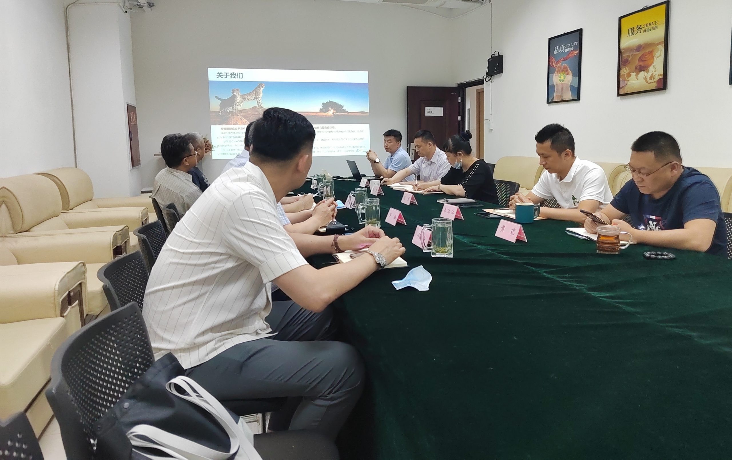 交流会开始,刘总首先对招商工作组领导一行莅临我司表示欢迎。随后,刘总就公司的发展历程、主营业务、重点产品方向和项目案例等方面进行了介绍,同时在线演示了公司核心技术融合云计算、大数据、3D可视化、物联网终端等技术而形成的行业解决方案。听完刘总的汇报后,招商工作组的领导们对我司的技术研发水平、资源整合能力和以往取得的成绩予以了高度的赞赏和评价。接下来,招商工作组的领导就新疆地区招商引资优惠政策、项目资源及未来发展趋势等给我司做了详尽的介绍,同时对双方未来的合作表示期许。