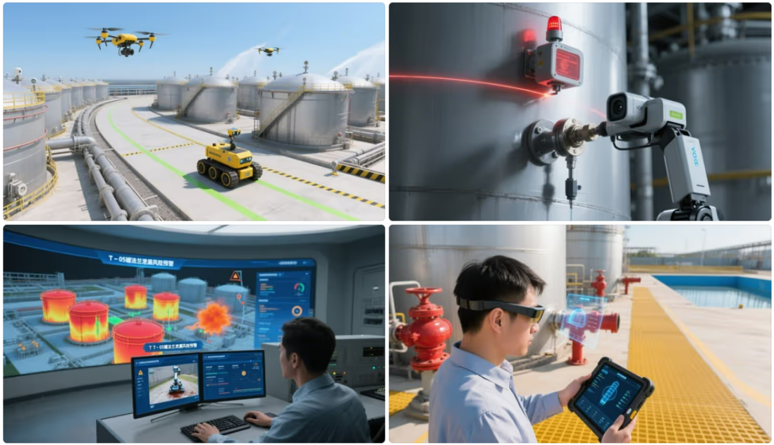 无人机/机器人巡检:无人机搭载红外热成像仪,自动扫描高空设备(储罐、屋顶管道)腐蚀、泄漏点,生成厂区风险热力图。防爆机器人替代人工进入易燃易爆区域,执行核查等任务。