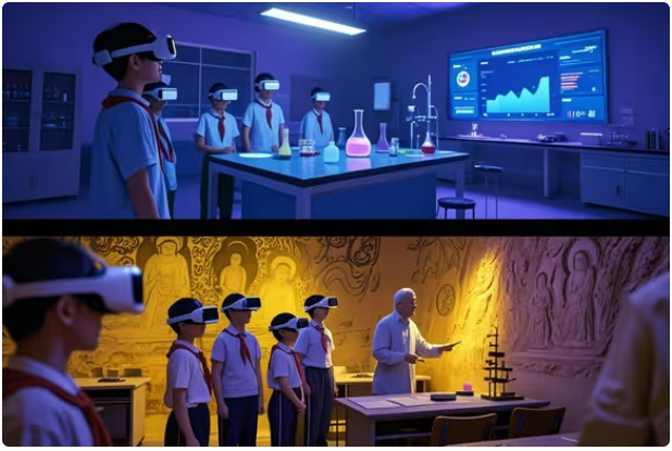 沉浸式学习场景:①VR/AR 实验室:模拟生物解剖、历史场景复原(如宋代市井生活),降低实验设备采购成本;②虚拟项目空间:支持跨班级、跨校协作(如「西湖水质保护」项目),学生通过数字分身开展调研。