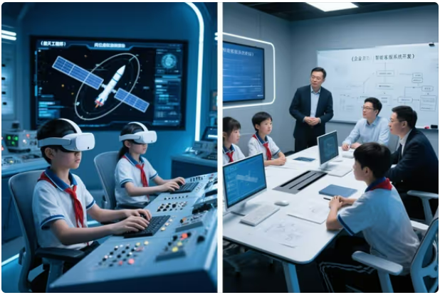 行业体验模块:①引入企业真实项目(如工业互联网生产线优化),学生通过虚拟仿真参与;②开发「职业体验周」,提供医疗、编程等 10 + 行业模拟岗位。